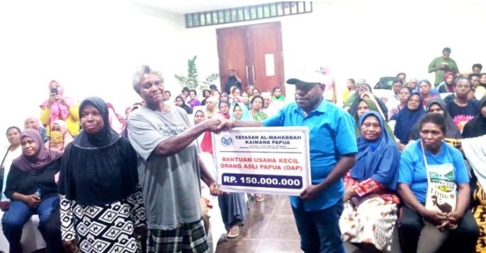 Ketua Yayasan Al Mahabbah, Hasan Slamet Sirfefa, menyerahkan bantuan saat pertemuan antara Jamiah dan mama-mama penjual pinang serta sayur di Grand Papua Hotel Kaimana, Minggu (2/11).