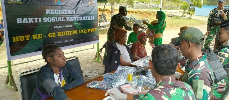 InfoMatoa, (Lanny Jaya) | Dalam rangka HUT ke-62 Korem 172/PWY, Kodim 1713/Lanny Jaya bersama Satgas Yonif 511/DY menggelar bakti sosial pengobatan massal dan karya bhakti membersihkan fasilitas umum. Kegiatan ini berlangsung di halaman Kantor Koramil 1713-01/Tiom, Distrik Tiom, Kabupaten Lanny Jaya, pada Rabu (5/11).