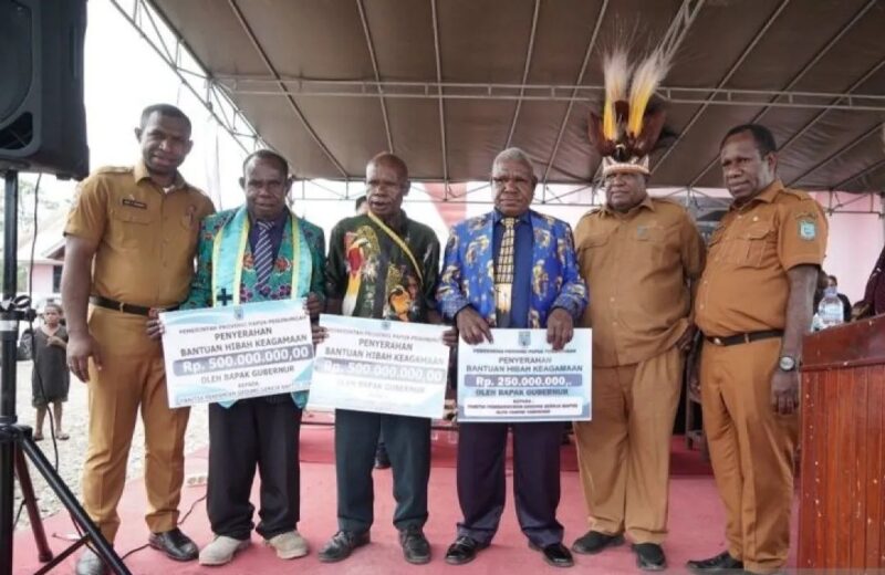 InfoMatoa, (Yahukimo) | Pemerintah Provinsi Papua Pegunungan memperkuat sinergi dengan lembaga keagamaan secara konsisten. Langkah ini menempatkan gereja sebagai pilar utama pembangunan daerah. Gubernur Papua Pegunungan, Dr. Jhon Tabo, mengunjungi Kabupaten Yahukimo pada Selasa (28/10). Selanjutnya, beliau menyerahkan bantuan hibah keagamaan senilai total Rp1,25 miliar. Bantuan tersebut bertujuan mendukung pembangunan tiga gereja di wilayah Yahukimo.