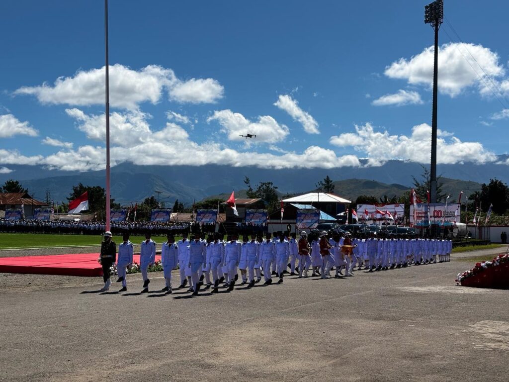 Upacara pengibaran bendera ini dipimpin langsung oleh Gubernur Papua Pegunungan, Dr. (HC) John Tabo, SE., M.BA., selaku Inspektur Upacara, dengan Komandan Upacara Mayor Inf Marsel Rumansara, S.H. (Wadan Yonif 756/WMS). Sekitar 1.000 orang turut hadir dalam prosesi tersebut.