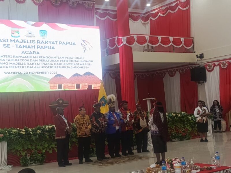InfoMatoa, (Jayawijaya) | Asosiasi Majelis Rakyat Papua (MRP) Se-Tanah Papua menyerahkan materi Rancangan Penggantian Peraturan Pemerintah Nomor 54 Tahun 2004 dan PP Nomor 64 Tahun 2008 kepada Menteri Dalam Negeri RI. Kegiatan ini berlangsung di Gedung Aithosa Betlehem, Distrik Wamena, Kabupaten Jayawijaya, Papua Pegunungan, Kamis (20/11). Dirjen Otonomi Daerah Kemendagri, Dr. Sumule Tumbo, S.E., M.M., memimpin kegiatan yang dihadiri sekitar 200 peserta. Mereka berasal dari pimpinan MRP enam provinsi di Tanah Papua, pejabat provinsi dan kabupaten, serta unsur TNI–Polri.