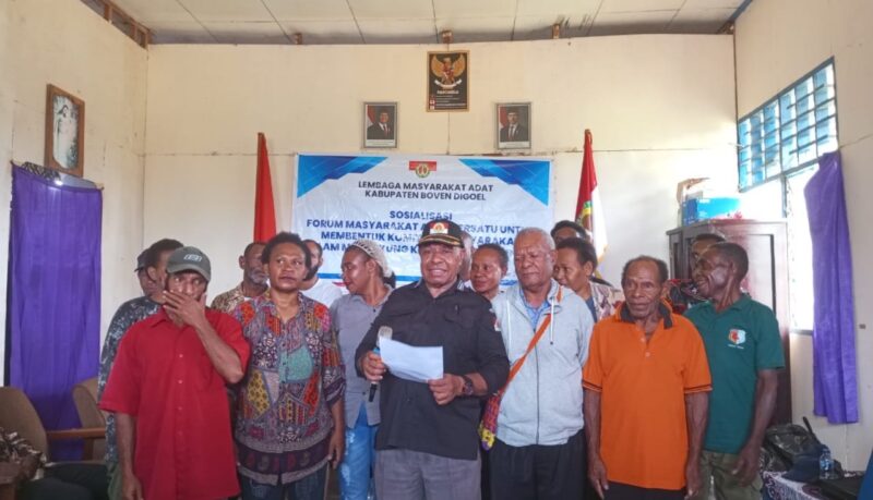 InfoMatoa, (Boven Digoel) | Lembaga Masyarakat Adat (LMA) Kabupaten Boven Digoel menggelar Sosialisasi Forum Masyarakat Adat Bersatu untuk memperkuat komitmen masyarakat dalam mendukung program pemerintah secara nyata. Panitia menyelenggarakan kegiatan di Kantor Sekretariat LMA, Jalan Trans Papua KM 5, Kampung Persatuan, Distrik Mandobo, Kabupaten Boven Digoel, Papua Selatan, Kamis (23/10). Adrianus Moromon, S.Pd., Sekretaris Umum LMA sekaligus perwakilan Suku Muyu, memimpin seluruh rangkaian acara. Ia memastikan semua peserta aktif mengikuti diskusi dan memberikan masukan.