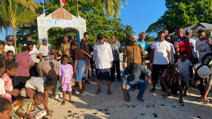 InfoMatoa, (Biak Numfor) | Bupati Biak Numfor, Markus O. Mansnembra, bersama masyarakat Kampung Sasari–Anobo, Distrik Aimando Padaido, melepas ratusan anak penyu atau tukik kembali ke laut sebagai bagian dari upaya pelestarian satwa dilindungi.