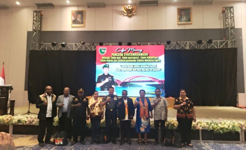 InfoMatoa (Kota Jayapura) | Kodam XVII/Cenderawasih menggelar Kegiatan Coffee Morning yang menghadirkan sejumlah tokoh penting di Papua. Acara ini bertujuan memperkuat peran pemuda dalam mewujudkan kemandirian ekonomi serta pengembangan sumber daya manusia Papua yang maju dan sejahtera. Kegiatan berlangsung di Ballroom Lantai 2 Hotel Suni, Abepura, Kota Jayapura, Senin (1/12). Berbagai tokoh adat, tokoh masyarakat, tokoh perempuan, tokoh pemuda, dan perwakilan Gerakan Mahasiswa Pemuda Indonesia (GMPI) ikut hadir.