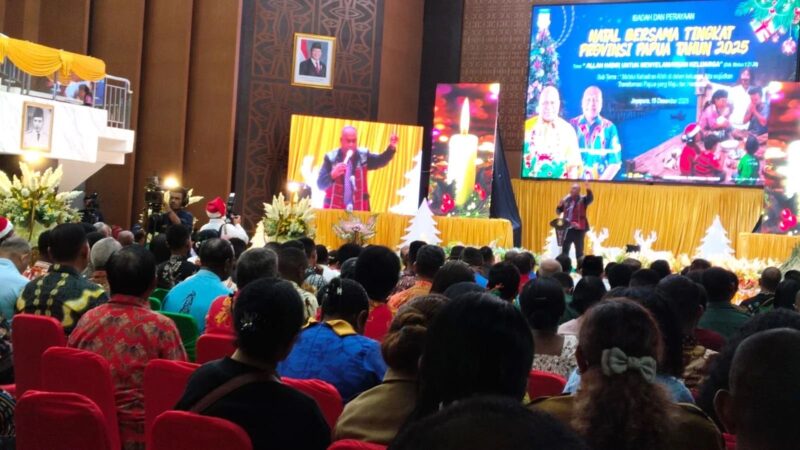 InfoMatoa, (Jayapura) | Pemerintah Provinsi (Pemprov) Papua menggelar Ibadah dan Perayaan Natal Bersama tingkat Provinsi Papua Tahun 2025 di Aula Sasana Krida, Kantor Gubernur Papua, Kota Jayapura, pada Senin (15/12). Perayaan dipercepat dari jadwal semula dan dihadiri sekitar 2.000 peserta, termasuk Forkopimda, pimpinan OPD, tokoh agama, tokoh adat, ASN, TNI, dan Polri.