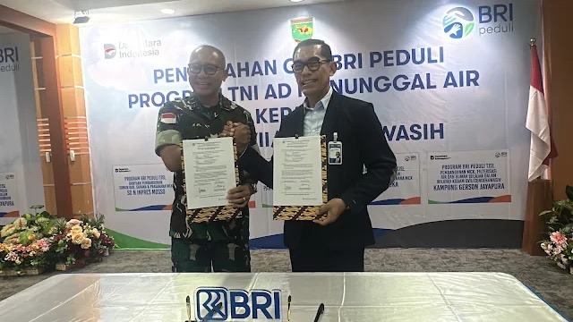 InfoMatoa, (Jayapura) | PT Bank Rakyat Indonesia (Persero) Tbk melalui Regional Office Jayapura memperkuat komitmen tanggung jawab sosialnya. Pihak bank menyerahkan bantuan sarana air bersih secara langsung kepada masyarakat. Selain itu, BRI bekerja sama dengan Kodam XVII/Cenderawasih dalam menjalankan program ini. Bantuan tersebut merupakan bagian dari CSR BRI Peduli yang berintegrasi dengan Program TNI AD Manunggal Air.