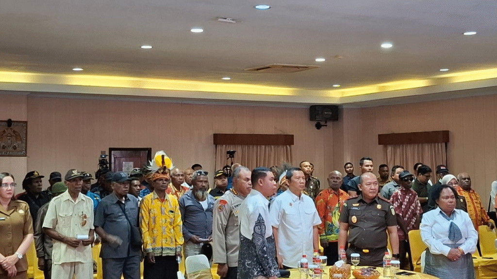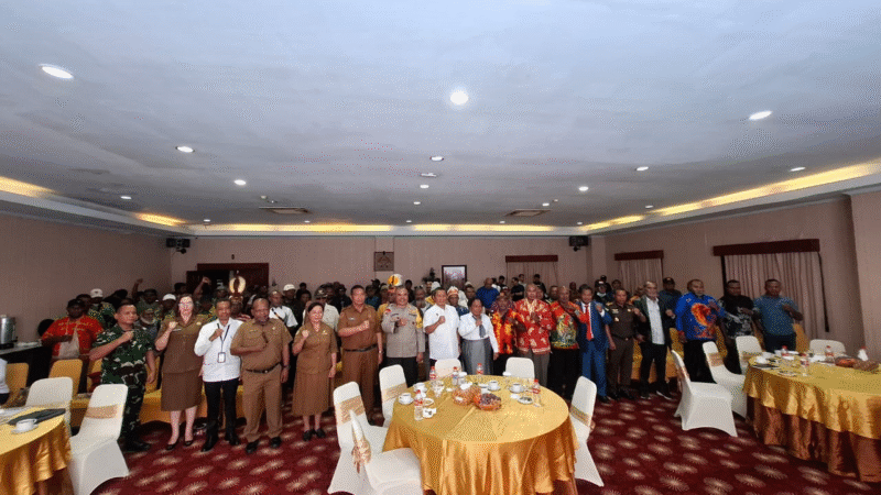 InfoMatoa, (Kota Jayapura) | Pada Selasa (12/8), berlangsung Sarasehan bertajuk “Papua Bersatu, Indonesia Maju Menuju Generasi Sehat, Ekonomi Mandiri dan Kampung Terpadu” di Ballroom Hotel Grand Tabi, Distrik Jayapura Selatan, Papua. Kegiatan ini digelar secara virtual bersama Kepala BIN, Menteri Koperasi dan UKM, Menteri Desa PDTT, serta Kepala Badan Gizi Nasional, dan dihadiri sekitar 150 peserta dari unsur pemerintah, tokoh adat, tokoh masyarakat, dan akademisi.