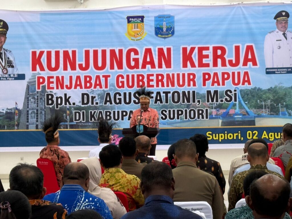 InfoMatoa, (Supiori) | Menjelang pelaksanaan Pemungutan Suara Ulang (PSU) Pemilihan Gubernur dan Wakil Gubernur Papua pada 6 Agustus 2025, Pejabat Gubernur Papua Drs. H. Agus Fatoni, M.Si melakukan kunjungan kerja ke Kabupaten Supiori. Kegiatan berlangsung di Aula Kantor Bupati Supiori, Distrik Supiori Timur. (2/8/2025)