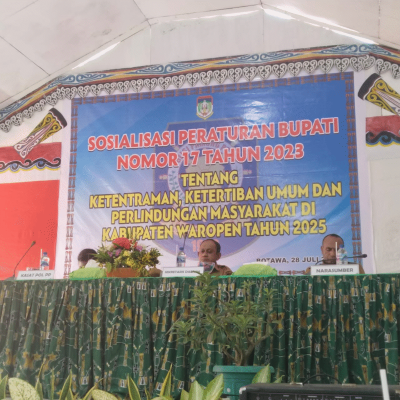 InfoMatoa, (Waropen) | Pada 28 Juli 2025, Pemerintah Kabupaten Waropen menggelar kegiatan sosialisasi Peraturan Bupati (Perbup) Waropen Nomor 17 Tahun 2023 tentang Ketentraman, Ketertiban Umum, dan Perlindungan Masyarakat, bertempat di Gedung Serba Guna GKI Imanuel Batu Zaman, Distrik Urei Faisei.